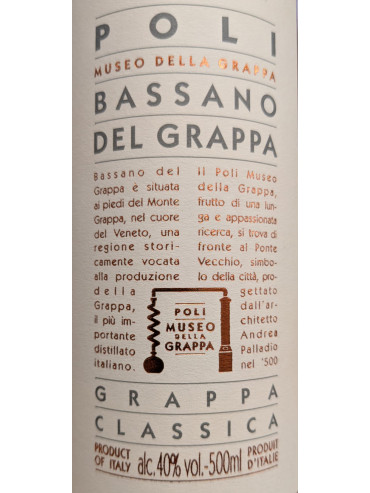 È una Grappa pulita, armonica e vivace come le uve delle colline da cui ha origine. L'aroma fruttato ed il gusto armonico e amabile rendono Poli Bassano Classica la Grappa ideale per il “rasentín”, rituale tipicamente veneto del dopo caffè.