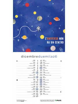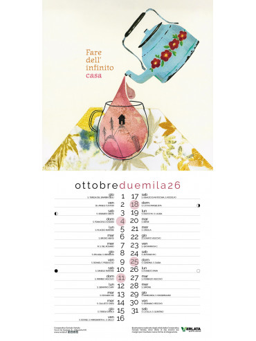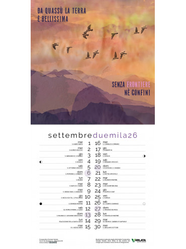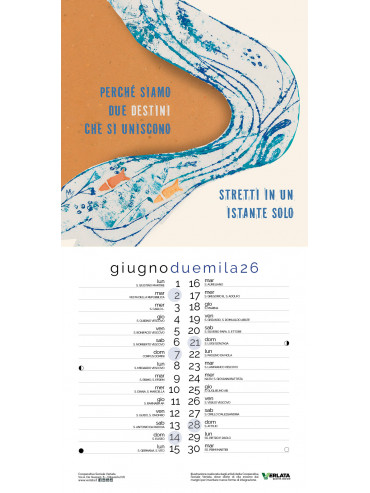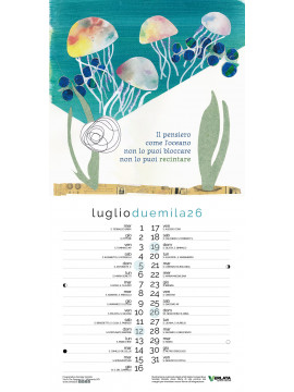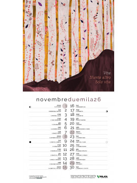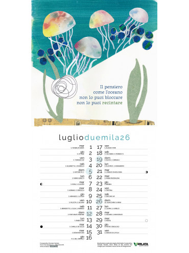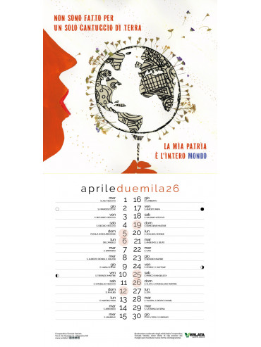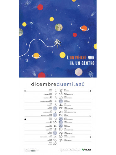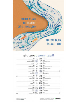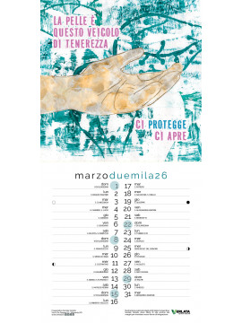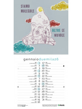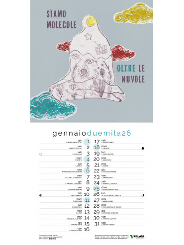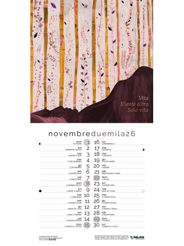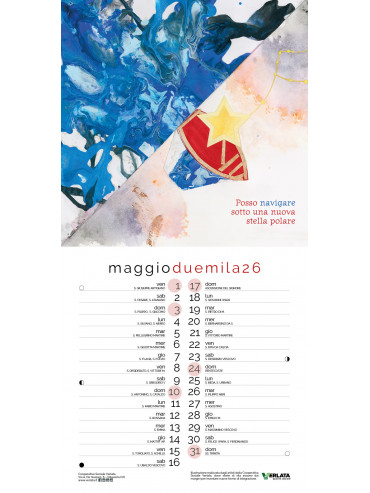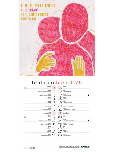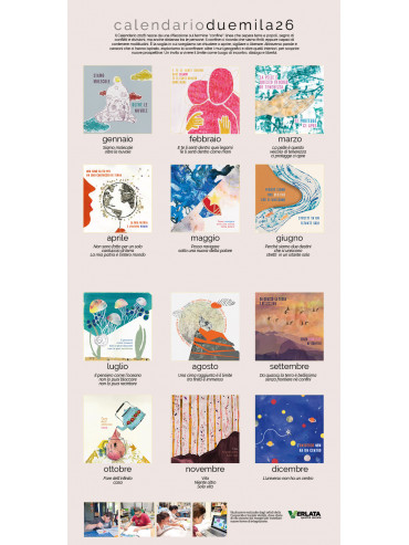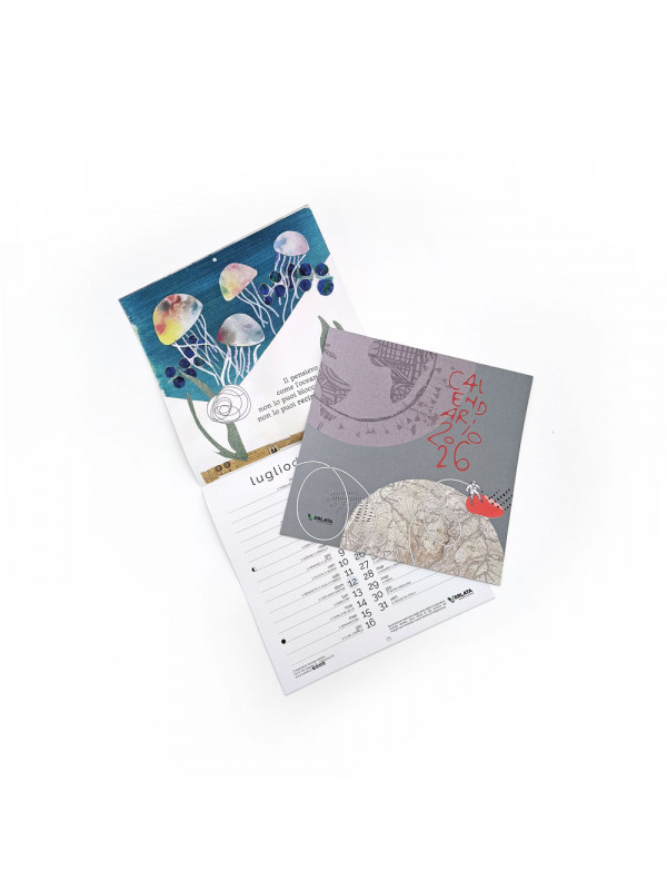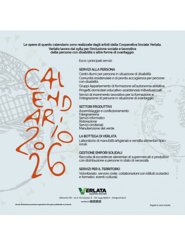 Calendario 2026 con pagine in carta riciclata, con foro per appenderlo. Le illustrazioni sono realizzate dagli artisti della Cooperativa Sociale Verlata, impegnati in percorsi di inclusione sociale e lavorativa.