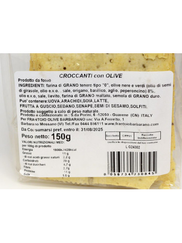 Croccanti sfoglie di pane cotte al forno, arricchite con l'olio extravergine del Frantoio Olive Barbarano e olive a pezzetti. Da gustare come snack così come sono o con l'accompagnamento di altri ingredienti per farne deliziosi crostini.