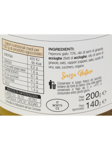 Peperoni gialli sott'olio preparati con aggiunta di acciughe e capperi, senza glutine e senza conservanti. Davvero sfiziosi! I peperoni gialli sono ottimi per completare un'insalata, o come stuzzichino da accompagnare ad un aperitivo.
