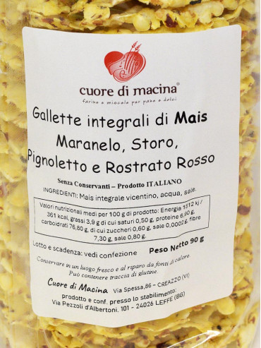 Queste gallette integrali sono fatte con varietà di mais antichi: mais Marano, Storo, Pignoletto e Rostrato Rosso di Ignago (VI). Abbandonate in passato perché poco produttive rispetto ai nuovi mais ibridi, negli ultimi anni hanno goduto di una riscoperta grazie alla loro tipicità regionale e soprattutto per la bontà del loro gusto e delle qualità nutritive.