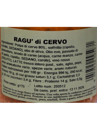 Sugo di carne preparato con polpa di cervo, denso e saporito. È un condimento ideale per paste all'uovo come le pappardelle, ma si abbina bene anche a polenta, lasagne e risotti.