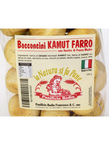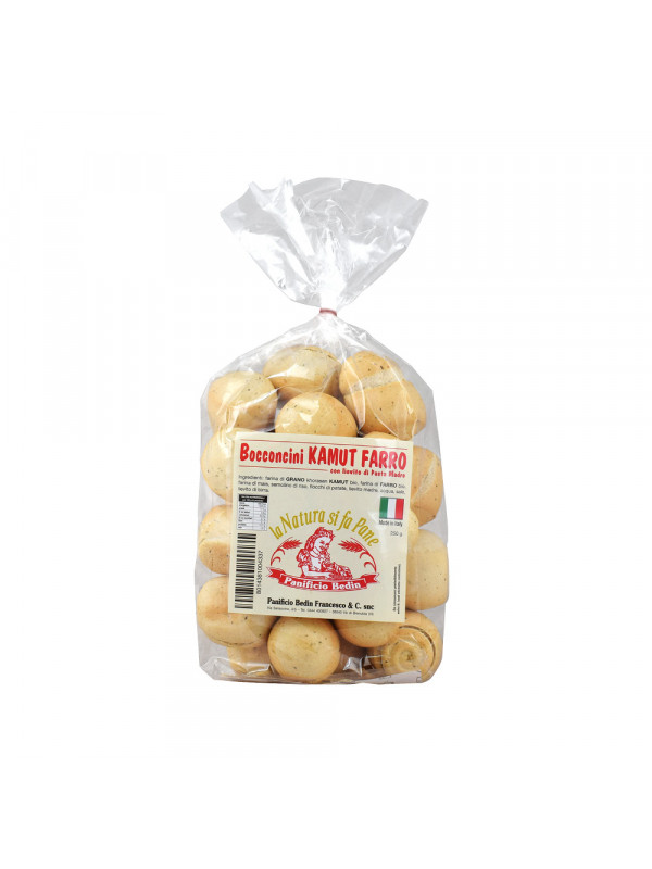 Questi Bocconcini hanno il gusto del kamut e l'aroma del farro: rustici, croccanti, sani, per accompagnare spuntini e aperitivi con un companatico dal sapore deciso.