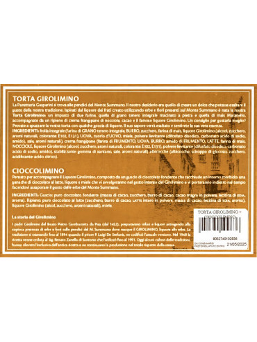 farina di GRANO tenero integrale, BURRO, zucchero, farina di mais, liquore Girolimino (alcool, zucchero, aromi naturali, colorante E102, €131) UOVA, tuorlo d'UOVO, miele, polvere lievitante (difosfato disodico, carbonato acido di sodio, amido), sale, aromi naturali.